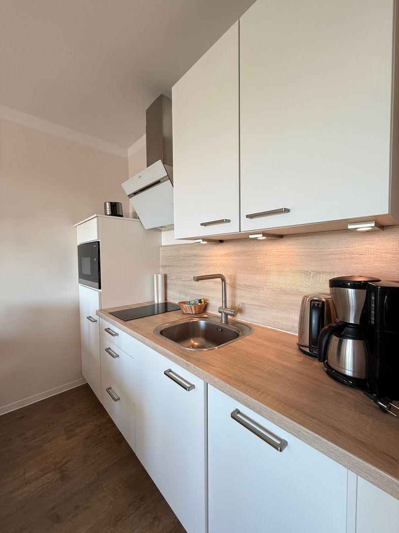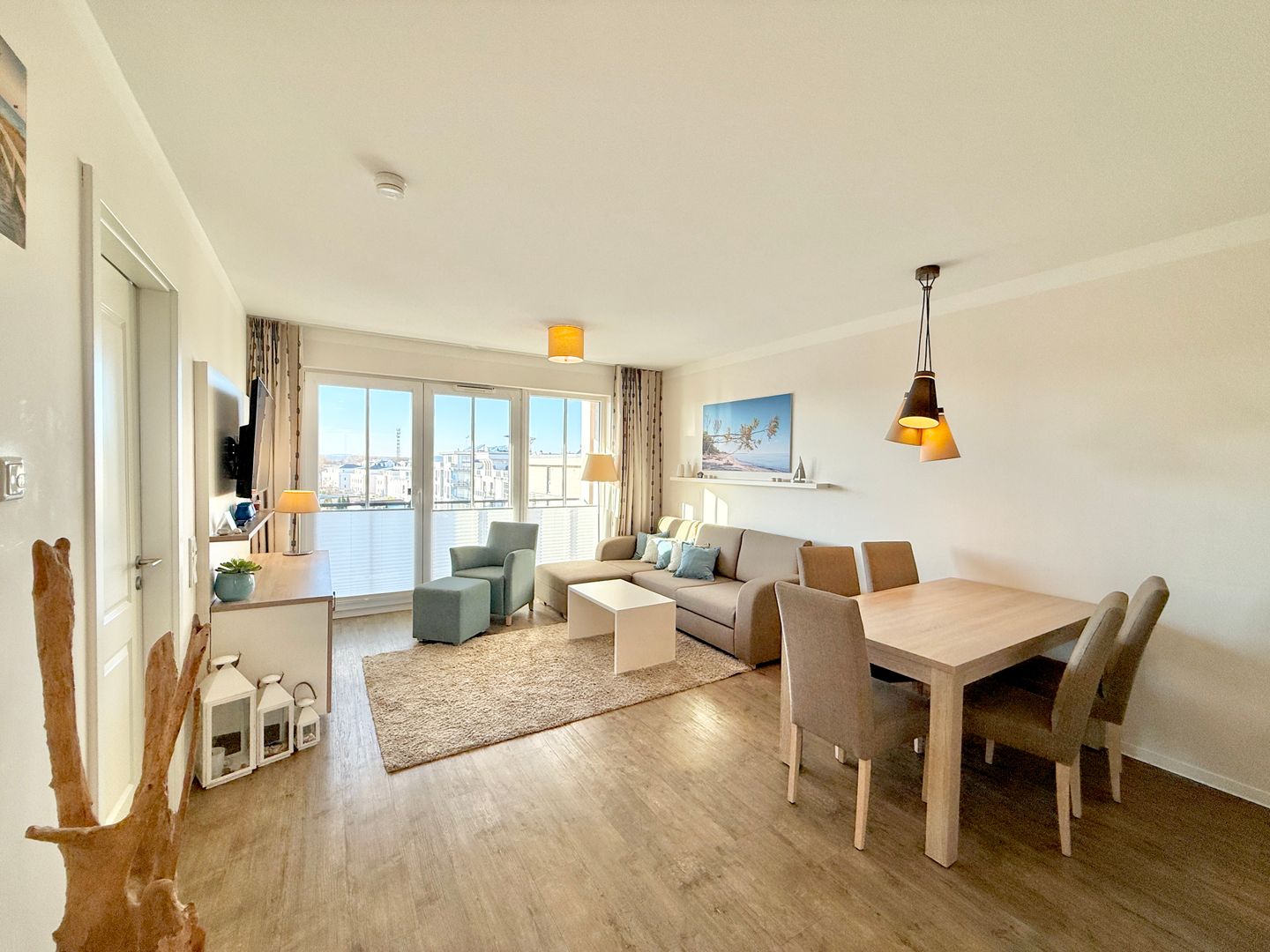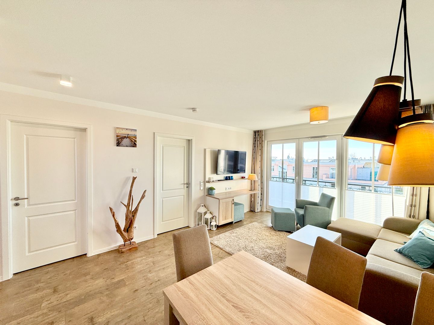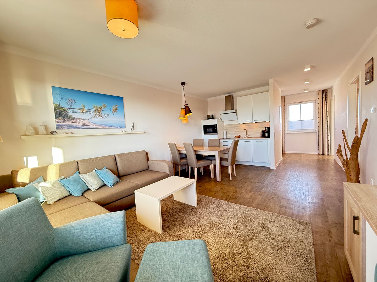 Die Eigentumswohnung ist sehr geschmackvoll und vollständig eingerichtet. Die 3 Zimmer-Wohnung verfügt über ca. 62 m² Wohnfläche und teilt sich auf in ein Tageslichtbadezimmer mit ebenerdiger Dusche, ein Wohnbereich (Schlafcouch) mit angrenzender offener Küche (ausgestattet mit Kühlschrank, Ceranfeld, Geschirrspüler und Mikrowelle) und integrierter Essecke, sowie über einen sehr großzügigen und überdachten Balkon mit wunderschönem seitlichen Meerblick in West-Ausrichtung.