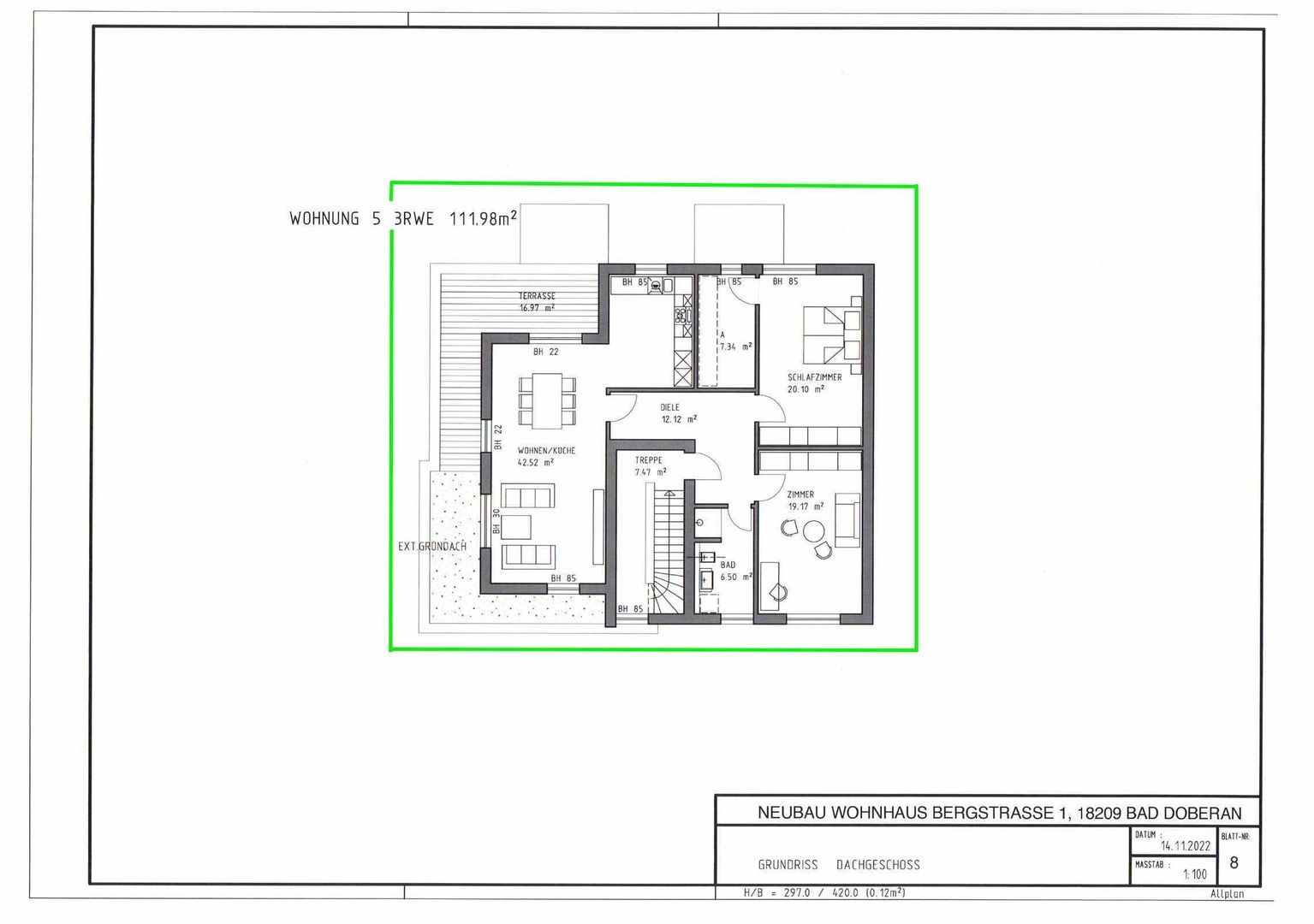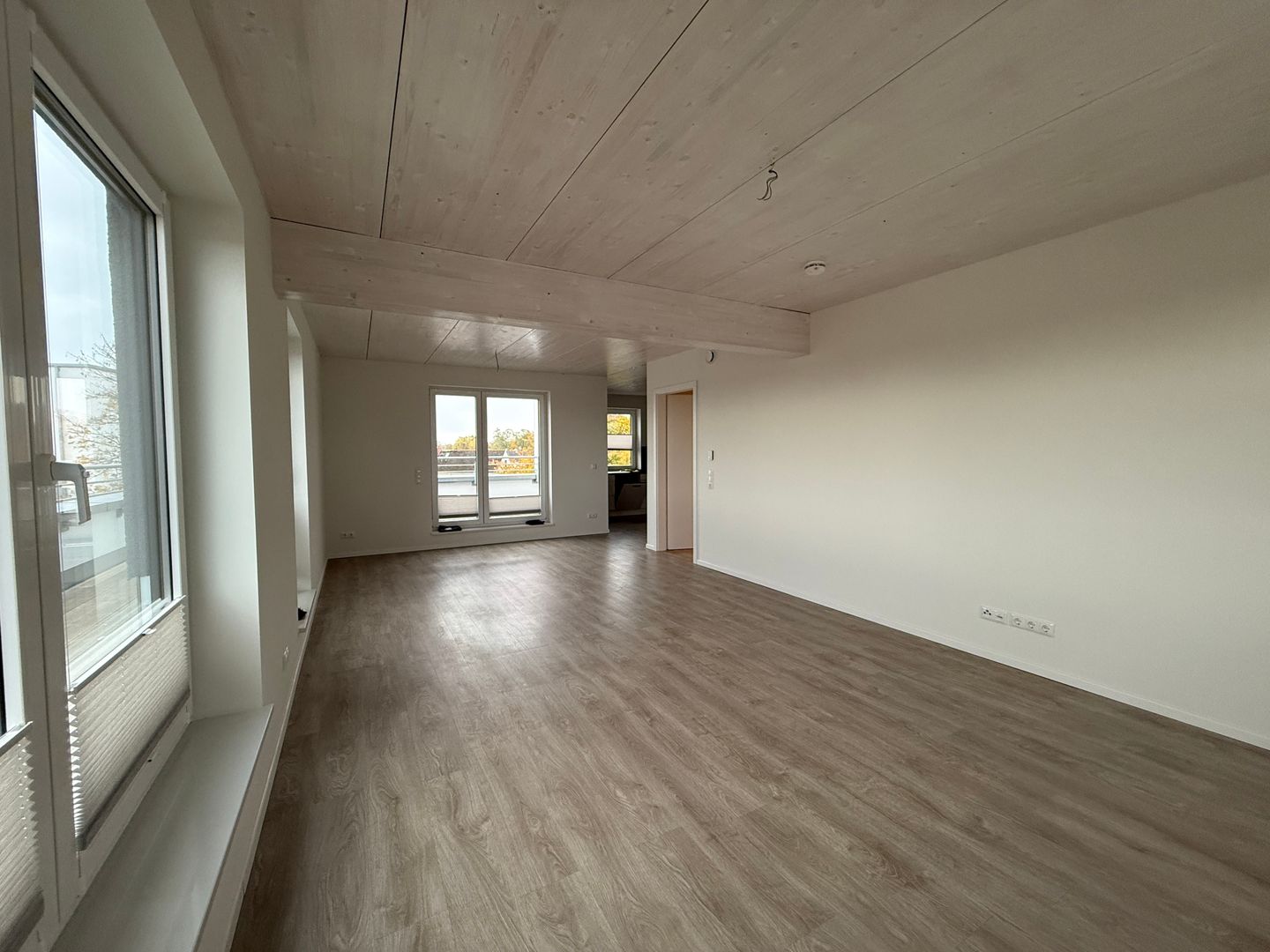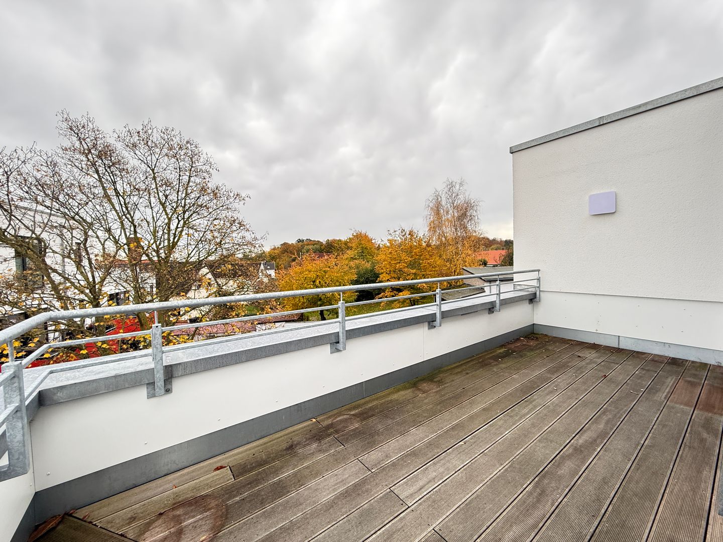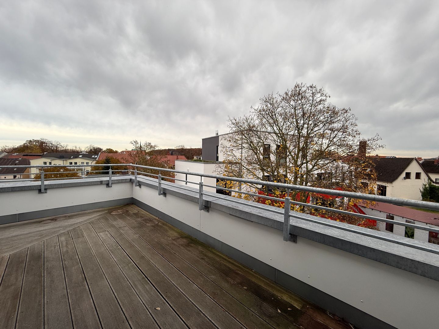 Sie verfügt über ca. 111,98 qm und teilt sich auf in eine Wohnküche, einem Badezimmer mit Dusche und einem Waschmaschinen Anschluss, sowie einem Schlafzimmer mit Ankleidezimmer und einem zweiten Schlafzimmer auf. Absolutes Highlight dieser Wohnung ist die Dachterrasse.