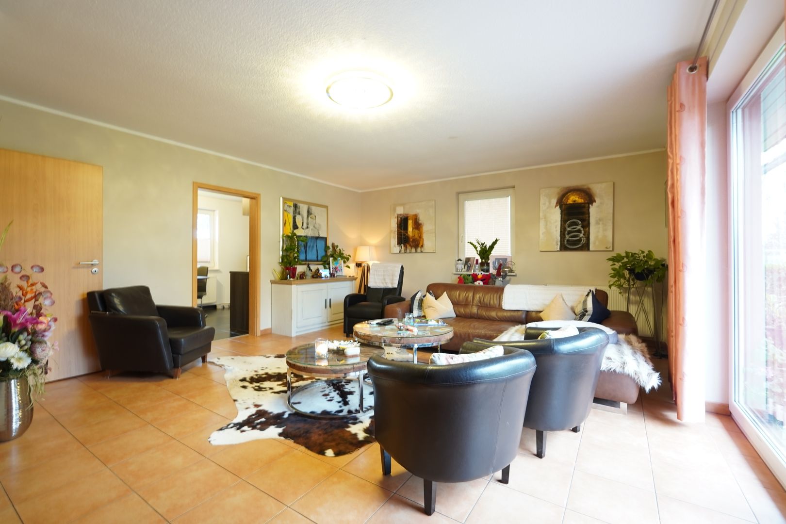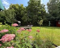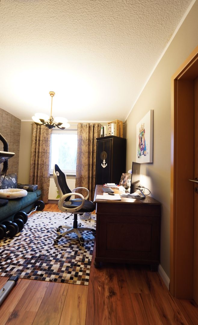 Angrenzend befindet sich das derzeitige Büro, dieses ist ein Durchgangszimmer und führt Sie zum Schlafzimmer. Auch dieses erstrahlt mit bodentiefen Fenstern zum Garten und bietet Ihnen schon am Morgen einen einzigartigen Ausblick in den Garten.