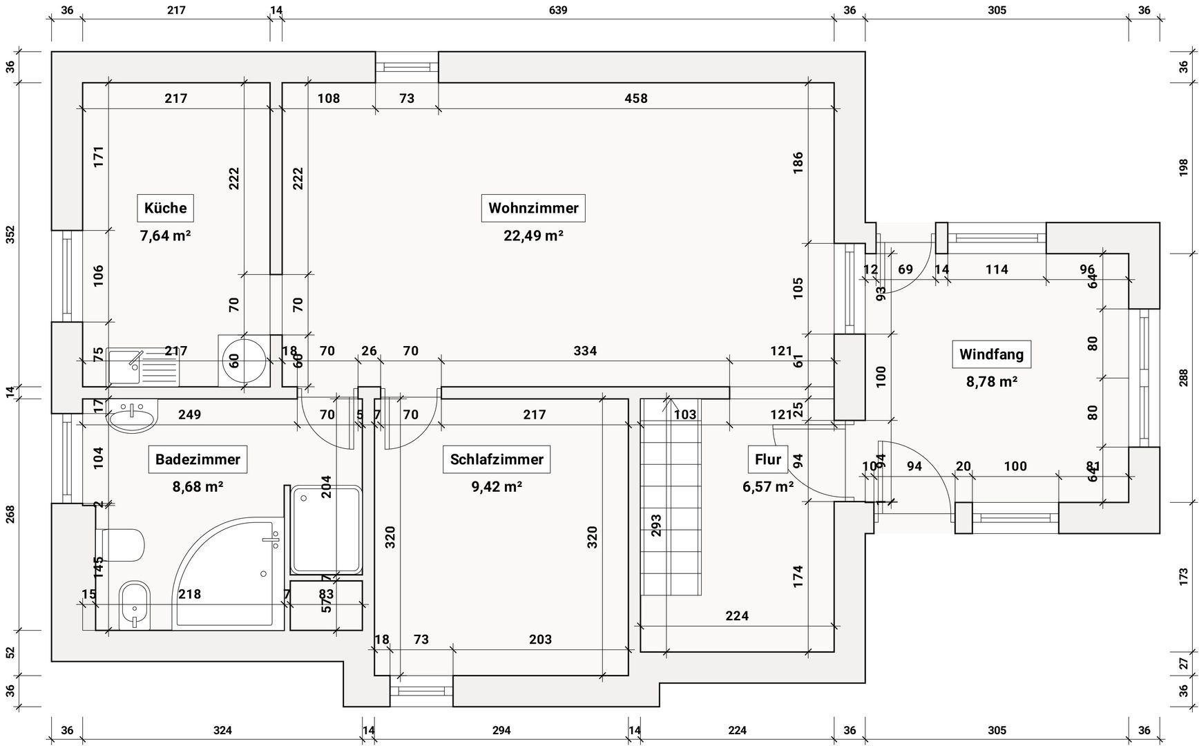 Im Haus befinden sich derzeit 2 Schlafzimmer, ein Badezimmer mit Badewanne und die Küche die Sie wiederum in den sehr großzügigen Wintergarten führt von dem aus Sie einen fantastischen Blick in den Garten haben.