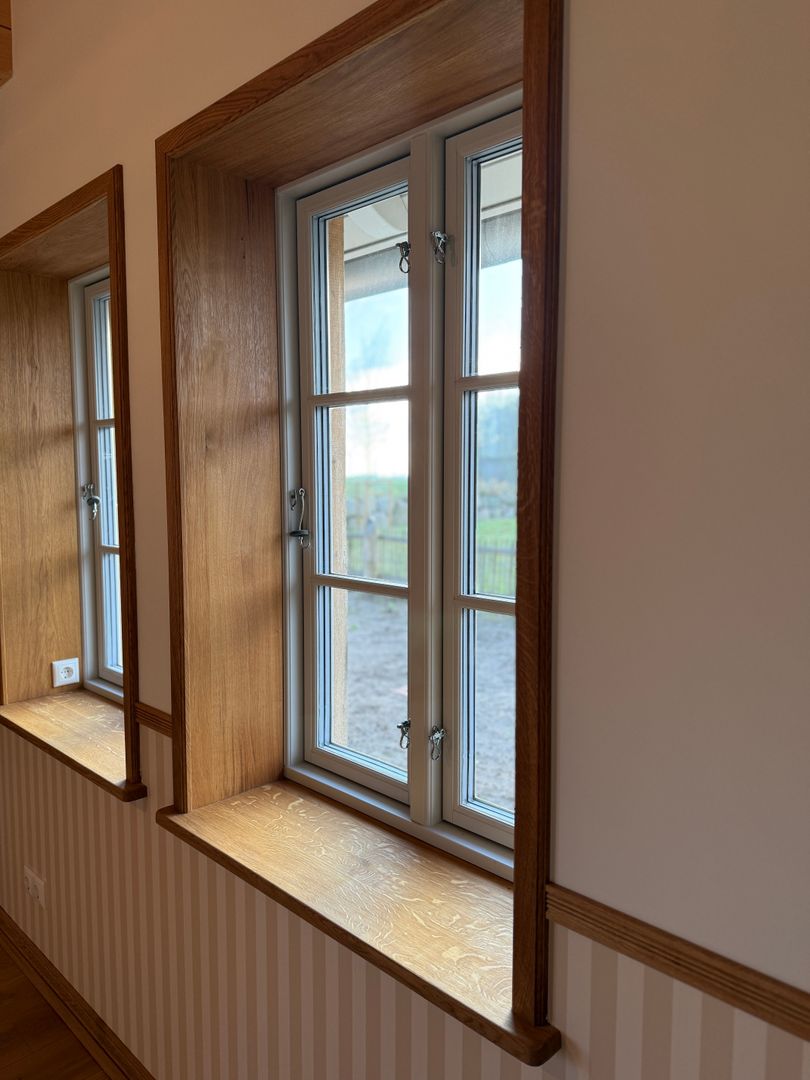 Alle Fenster und Terrassentüren werden als weiße oder farbige Holzfenster montiert, die Verglasung erfolgt 3-Fach. Alle Außentüren im Haus sind 3-Fach verriegelt, mit Lichtausschnitt und Sicherheitsschloss ausgestattet.