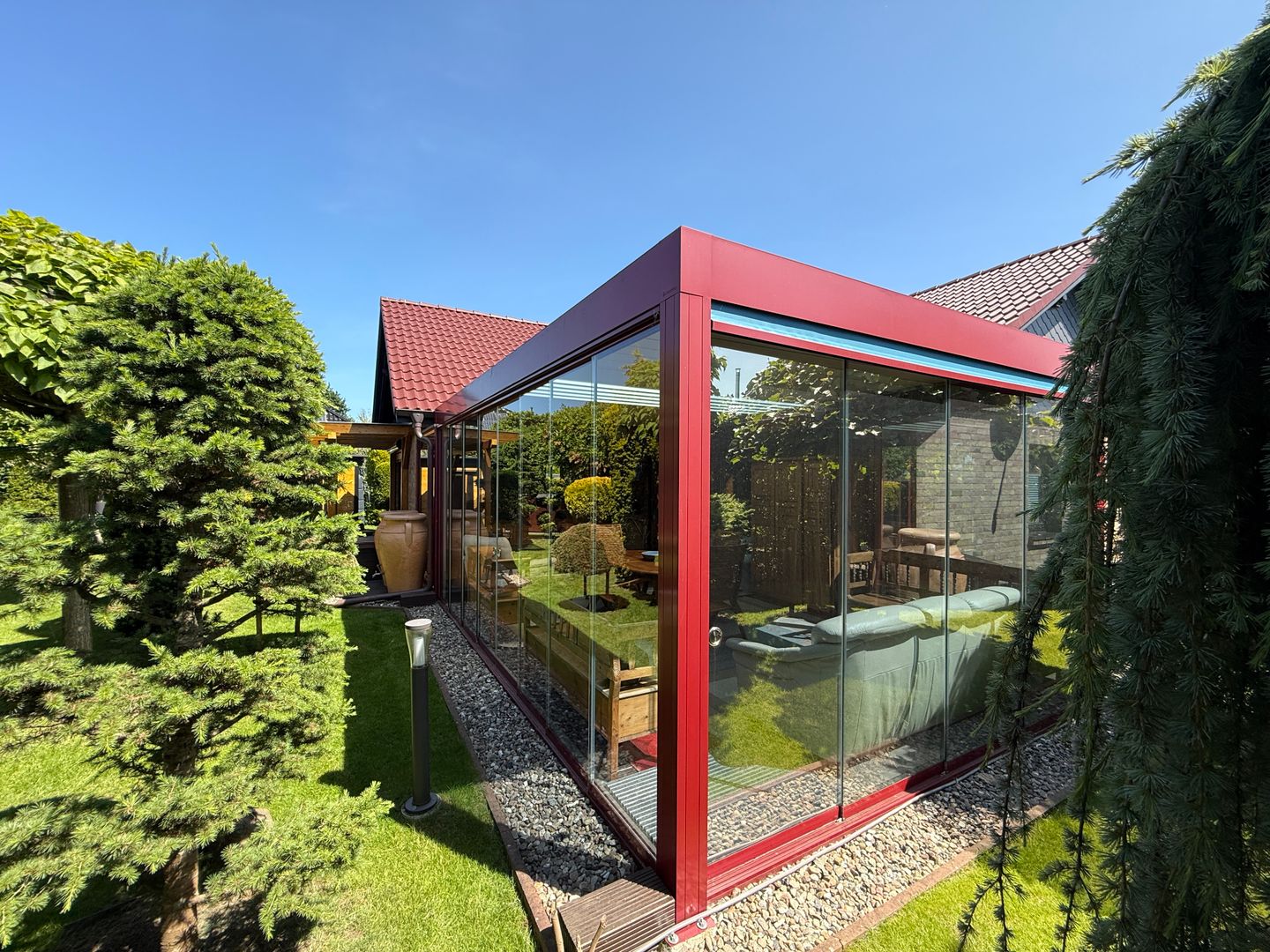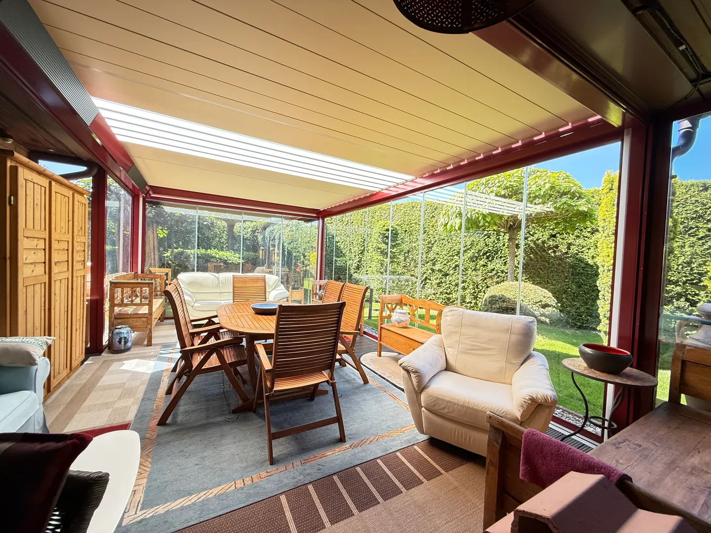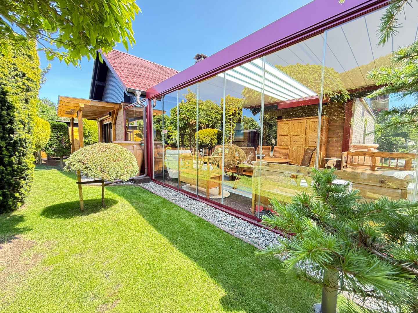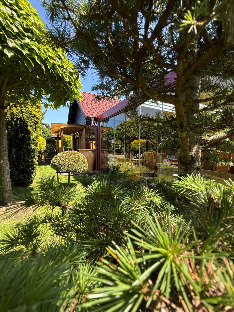Der großzügige und mit echt Glas versehene Wintergarten verfügt nicht nur über einen Kamin, sondern auch über eine LED -Beleuchtung, Bluetooth-Lautsprechern, einer Heizung sowie einem elektrischen aufklappbarem Lamellendach und elektrischen Rollos. Ein weitere Highlight: Das Objekt verfügt über 3 separate sehr hochwertige Saunen (1 Fasssauna wird nicht mit veräußert, eine Sauna mit angrenzendem Badefass/Hot Tub und eine in einem Saunahaus), welche Ihnen Wellness auf höchstem Niveau ermöglicht- ideal für Ihre persönliche Oase der Ruhe.