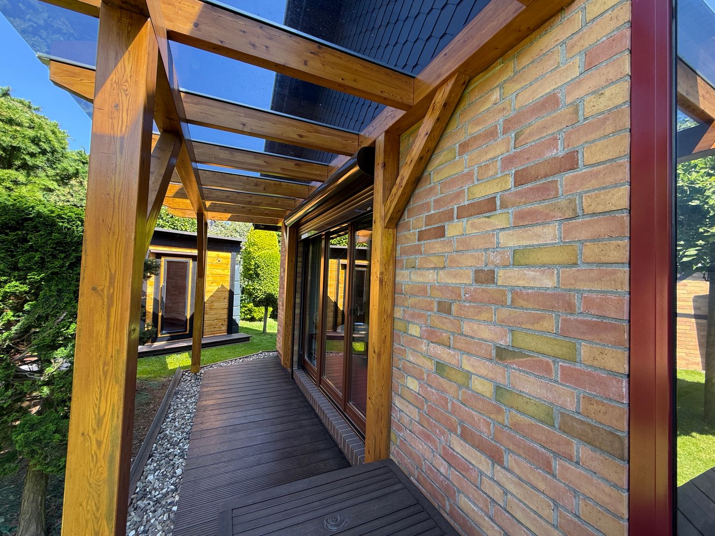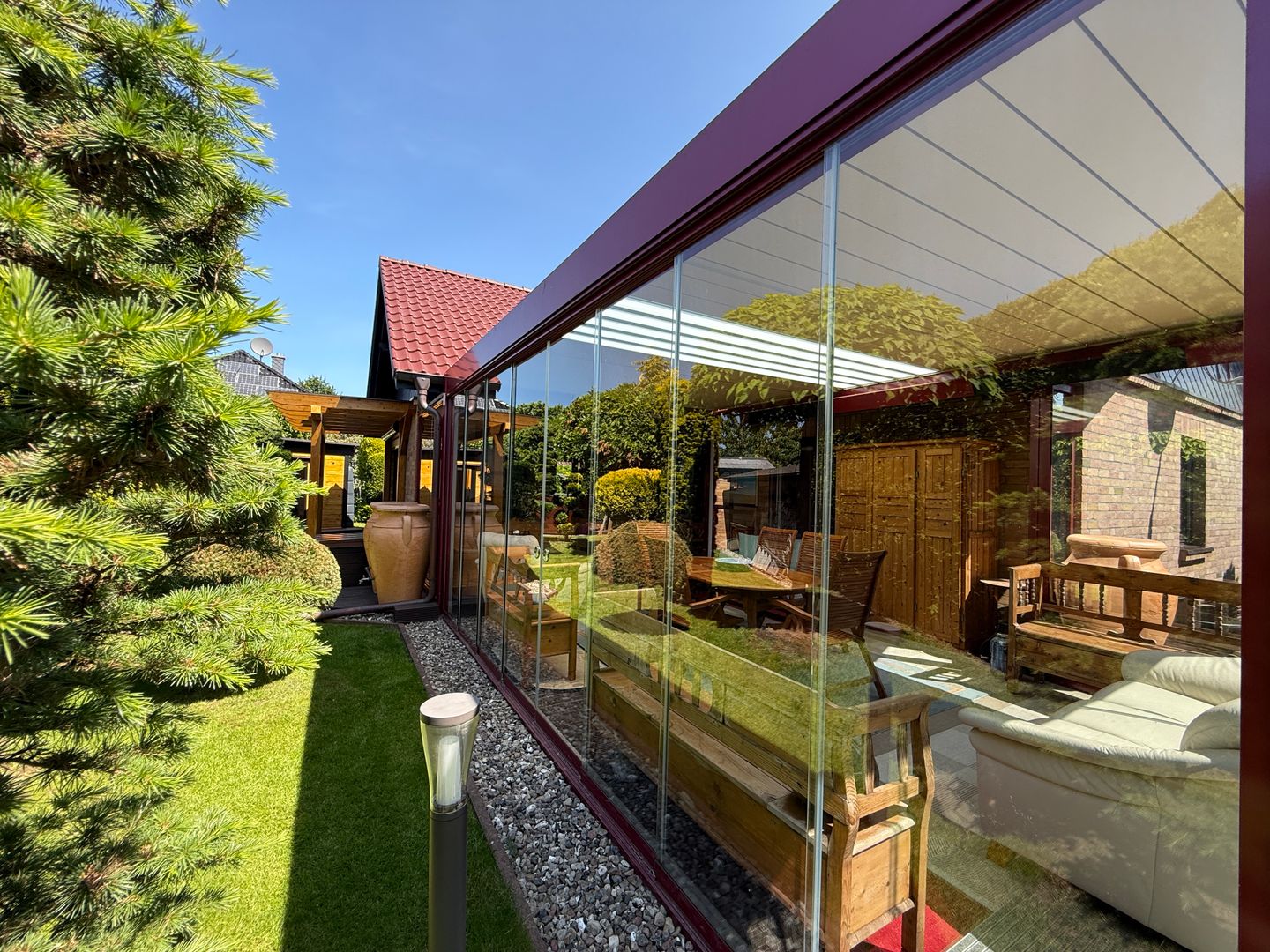 Am Wohnzimmer befindet sich weiterhin noch eine Pergola/überdachte Veranda.