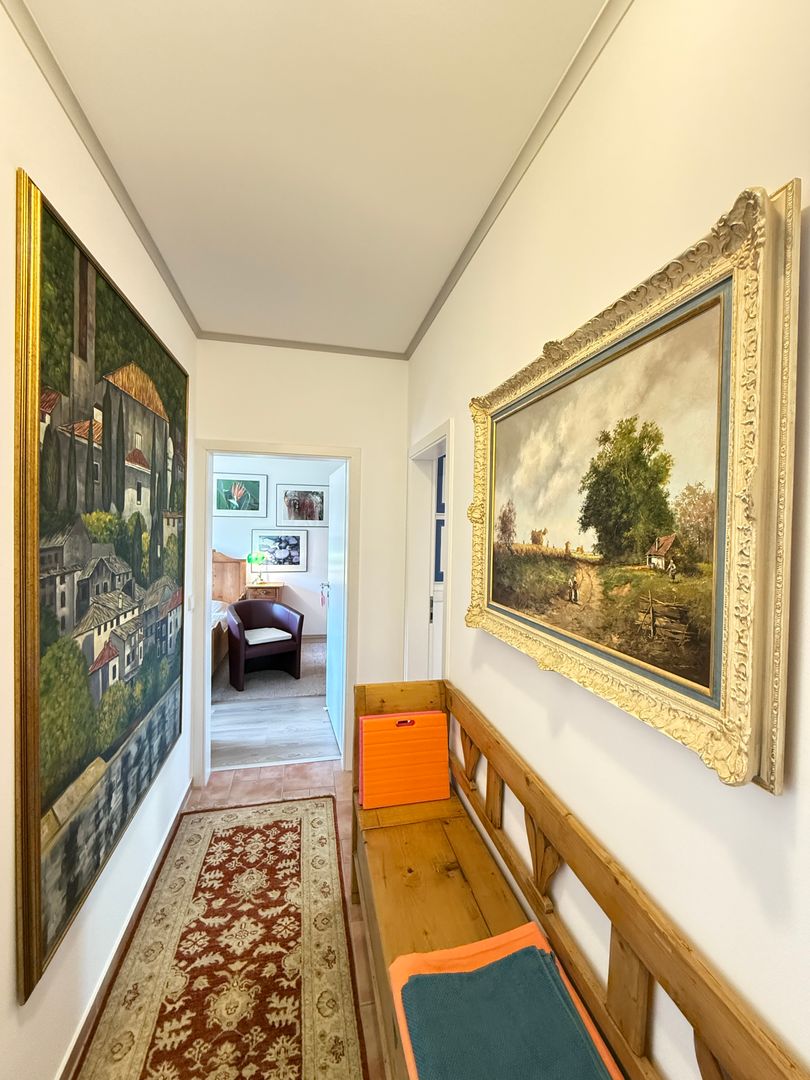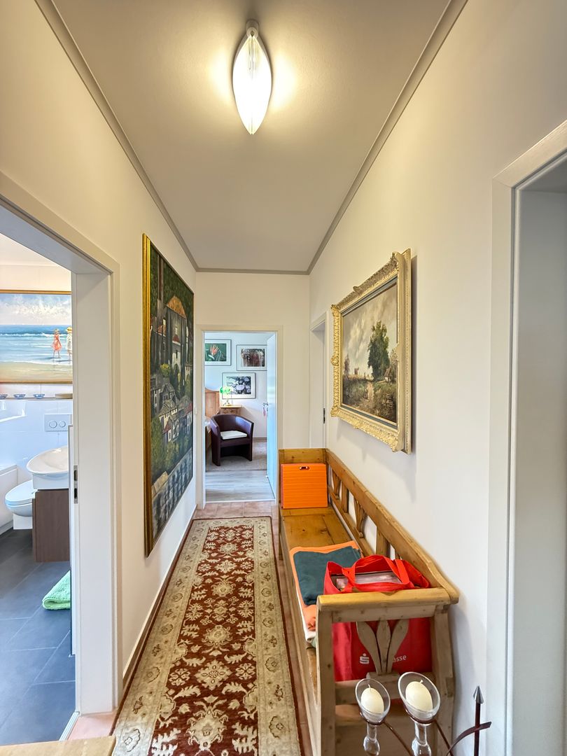 Einen großzügigen Hauswirtschaftsraum in dem sich auch die Technik des Hauses befindet. Weiter geht es den Flur entlang zum Badezimmer mit freistehender Badewanne und Dusch. Das Badezimmer wurde erst 2020 komplett saniert.