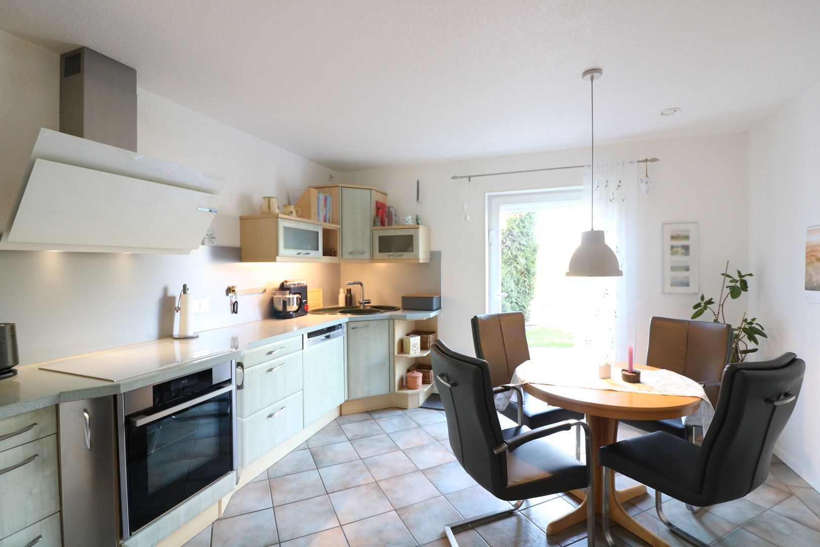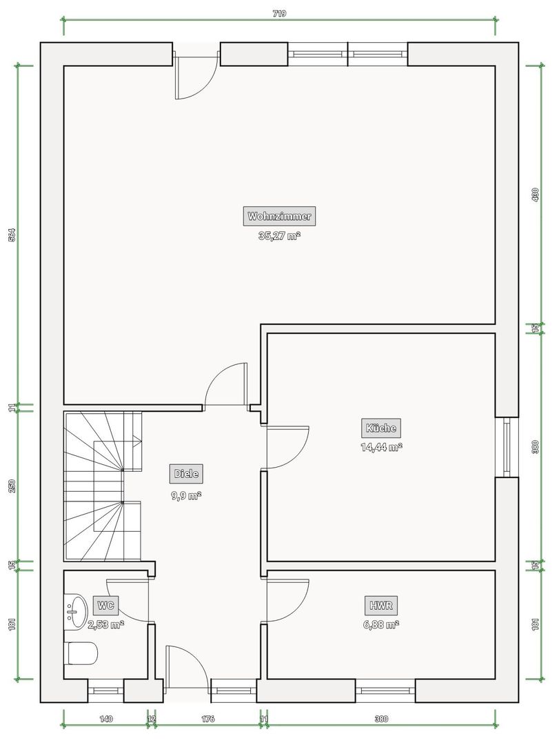 Im Erdgeschoss des Hauses befindet sich derzeit das Wohnzimmer, dieses führt Sie direkt auf die Terrasse zum Grundstück, ein Gäste-WC, ein Hauswirtschaftsraum und eine separate Küche mit Einbauküche.