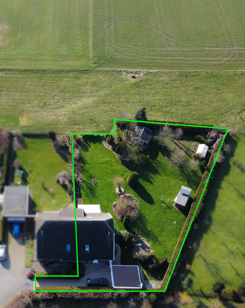 Die Grundstücksgröße beläuft sich auf ca. 1733qm. Das Grundstück wurde mit viel Liebe zum Detail angelegt und hat einen traumhaften Weitblick über die angrenzenden Felder und Wiesen. Sie finden auf dem Grundstück wunderschön angelegte Sonnenterrassen und kleine Sitzgelegenheiten um jeden Sonnenstrahl zu erhaschen, sowie ein kleines Gewächshaus (ca. 2x3m), ein Kinderspielhaus mit anschließendem Geräteschuppen (2x5m), sowie ein voll isoliertes Gartenhaus mit Stromanschluss 230/400V (ca. 3x5m).