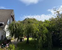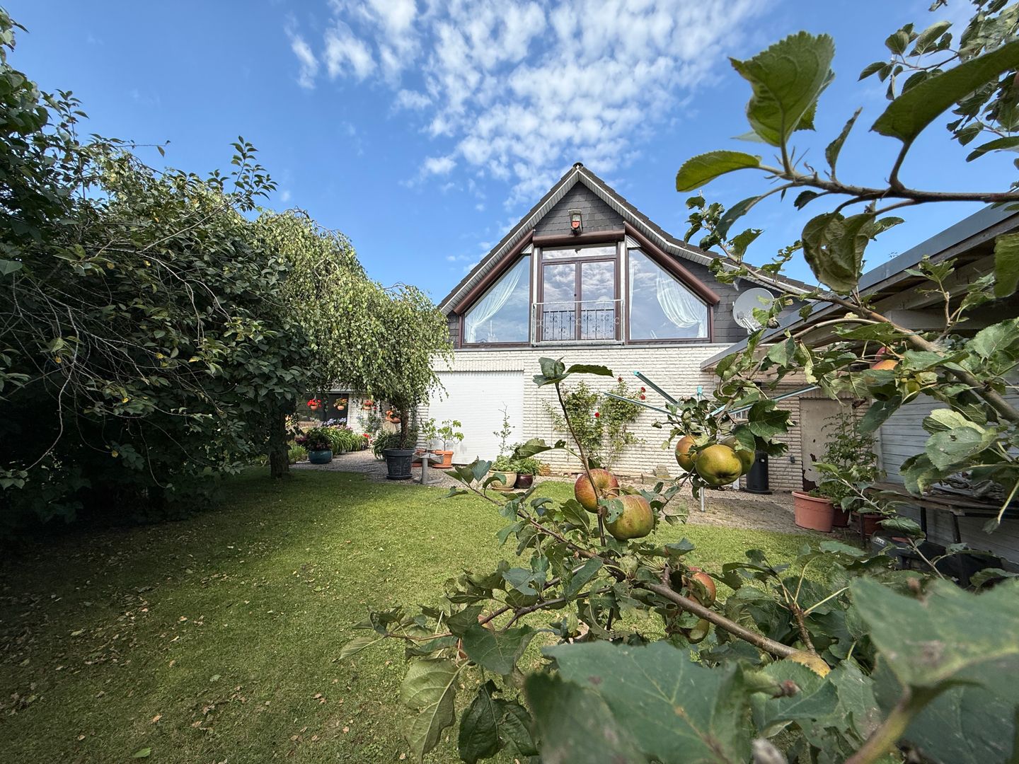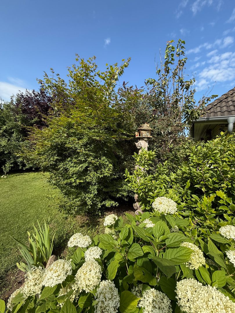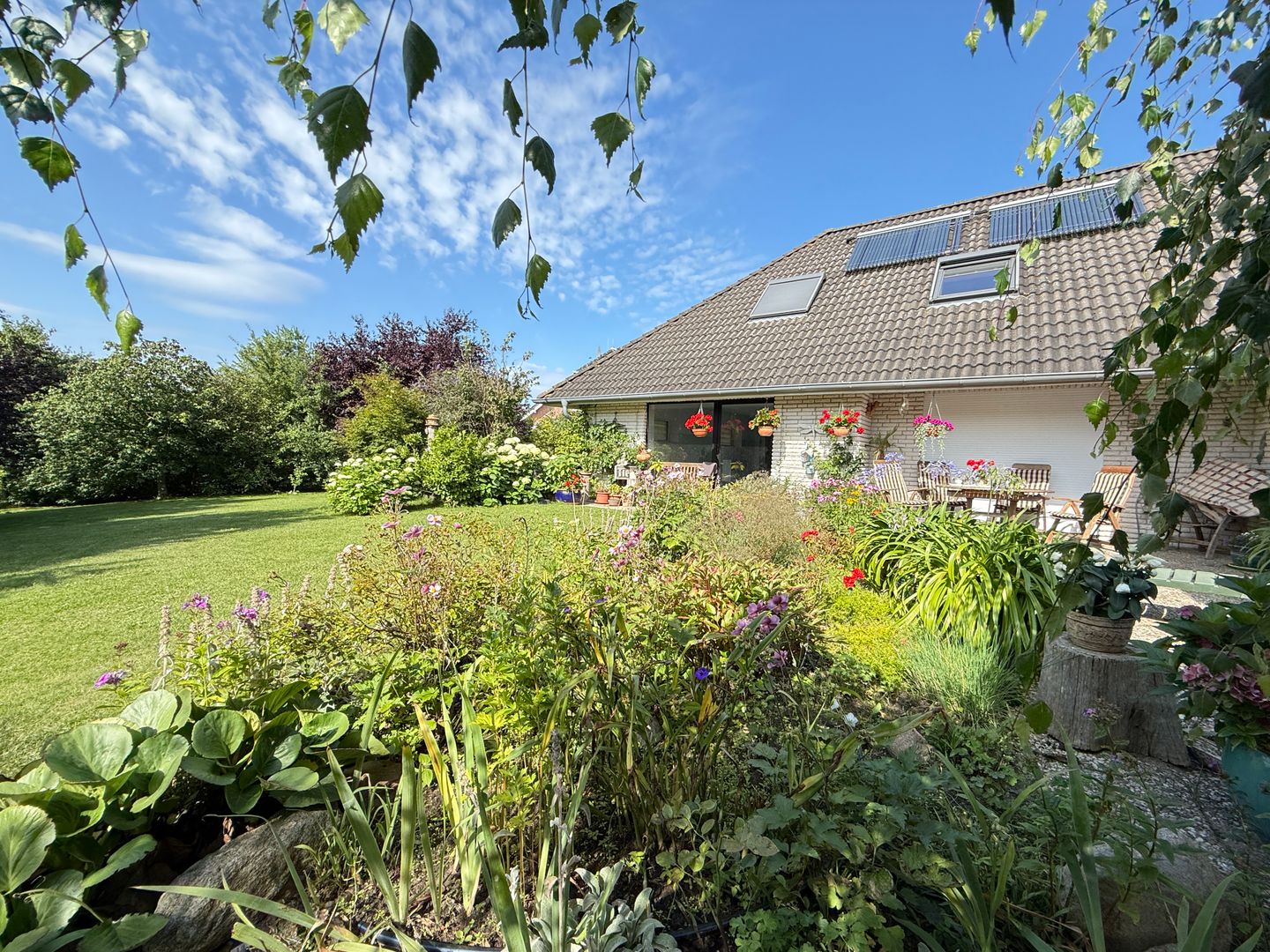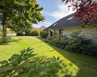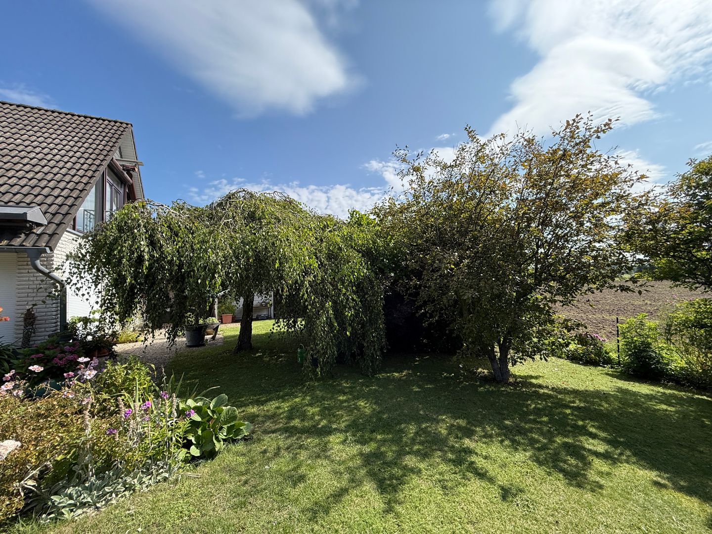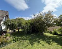 Das 1998 errichtete Haus empfängt Sie mit einem liebevoll angelegten Garten und einem unverbauten Blick über bunte Blumenbeete bis hin zum weiten Feld. Die großzügige Terrasse bietet Sonne von morgens bis abends und wird dank des üppigen Baumbestands zur privaten Ruheoase. Hinter dem Gartenzaun beginnt die Natur – Vogelsang, Felder und Gärten statt Autoverkehr – so dass Kinder gefahrlos spielen können und Ruhesuchende entspannen.