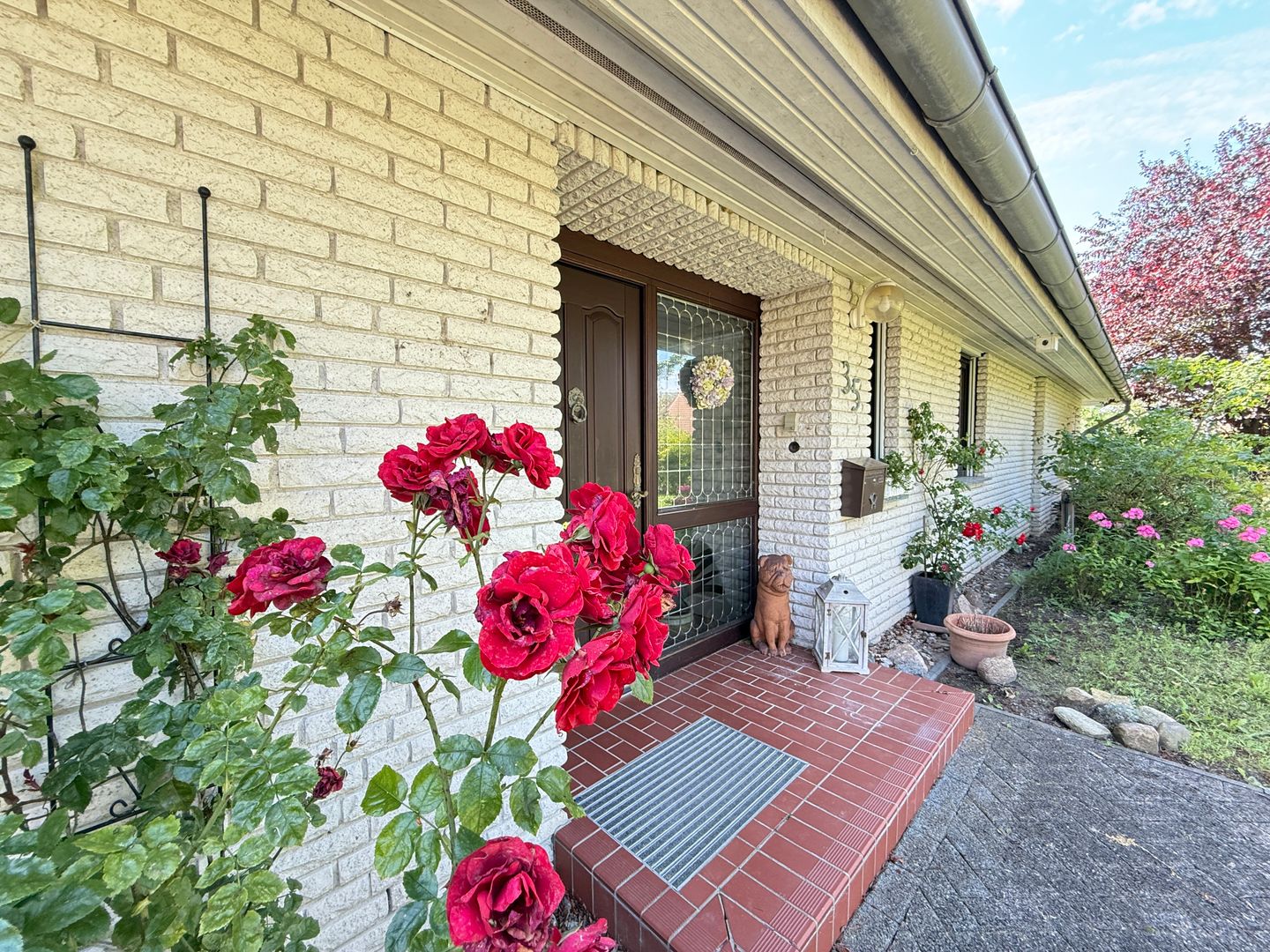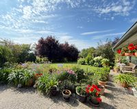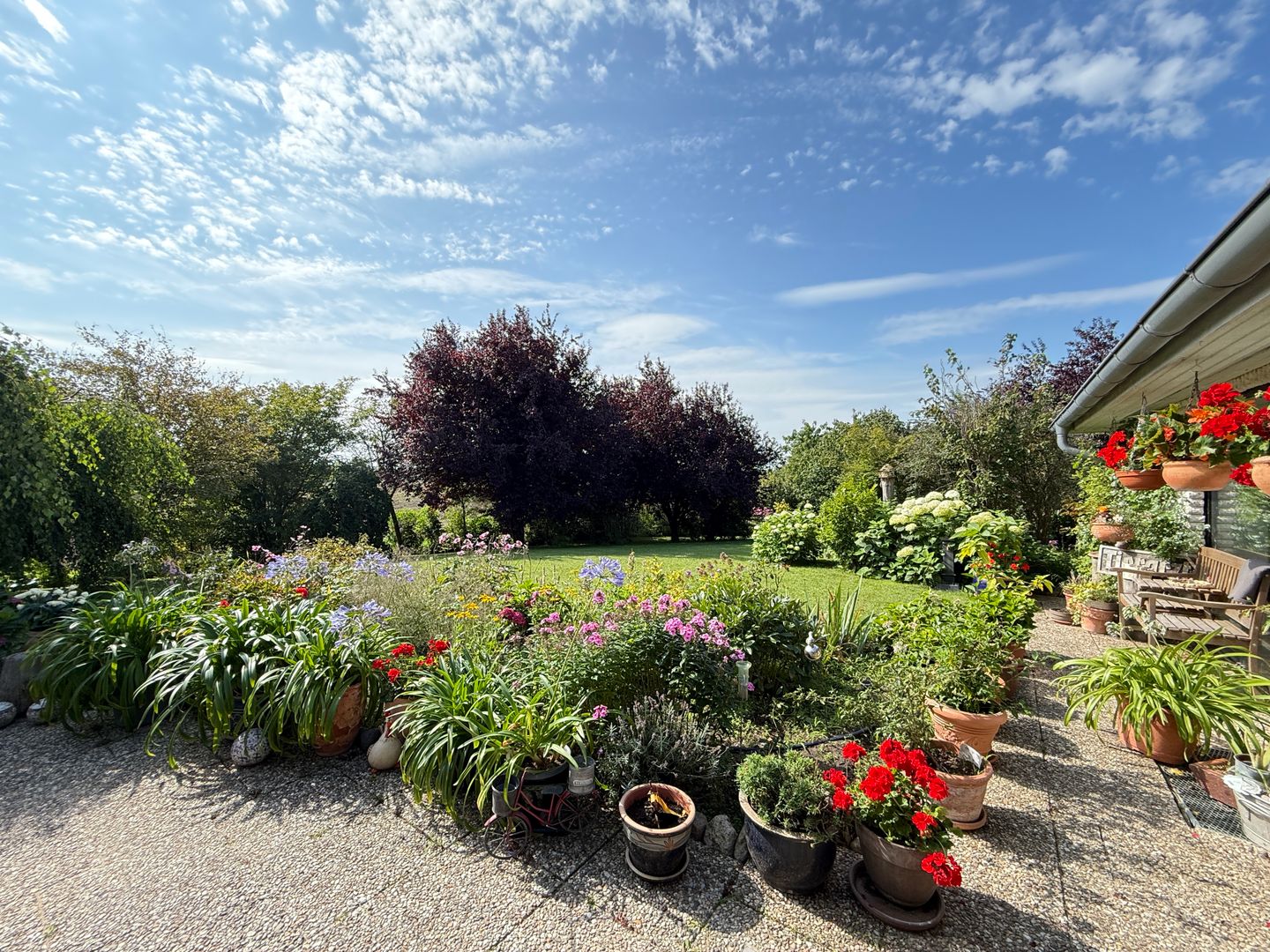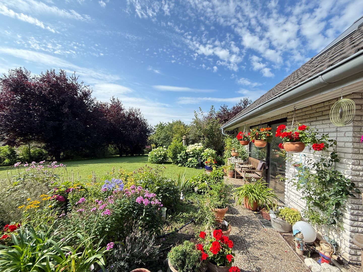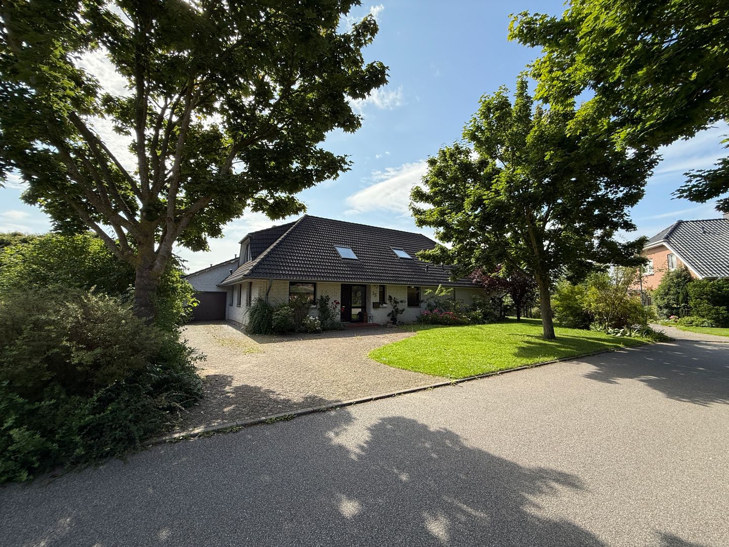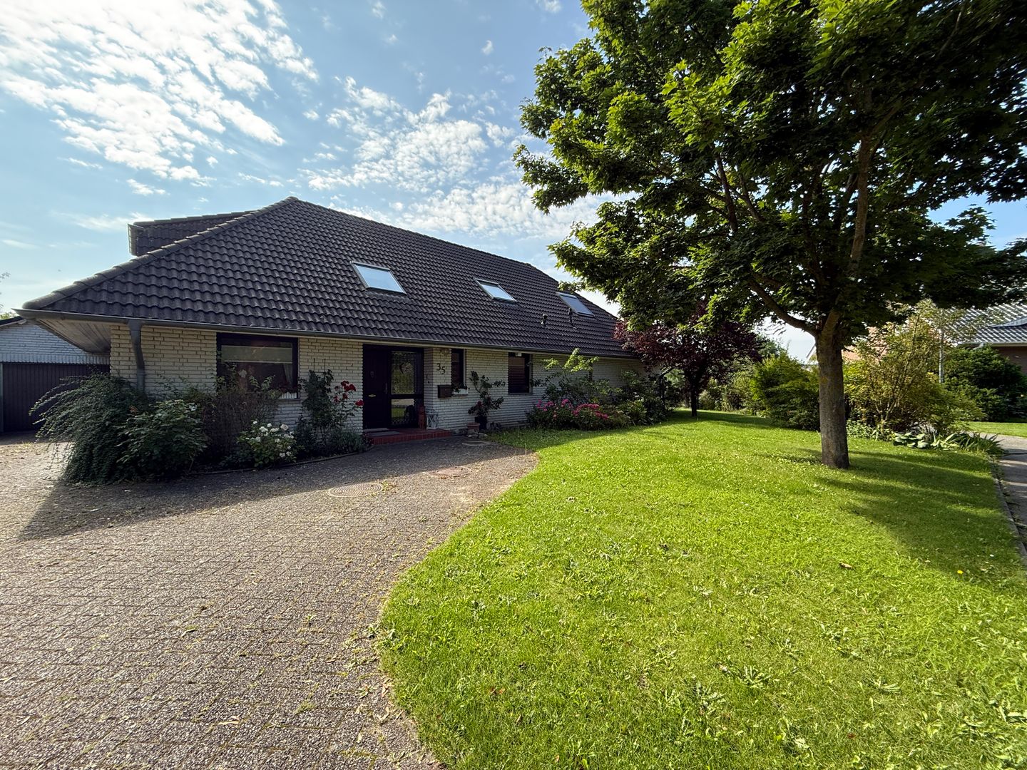 Das 1998 errichtete Haus empfängt Sie mit einem liebevoll angelegten Garten und einem unverbauten Blick über bunte Blumenbeete bis hin zum weiten Feld. Die großzügige Terrasse bietet Sonne von morgens bis abends und wird dank des üppigen Baumbestands zur privaten Ruheoase. Hinter dem Gartenzaun beginnt die Natur – Vogelsang, Felder und Gärten statt Autoverkehr – so dass Kinder gefahrlos spielen können und Ruhesuchende entspannen.
