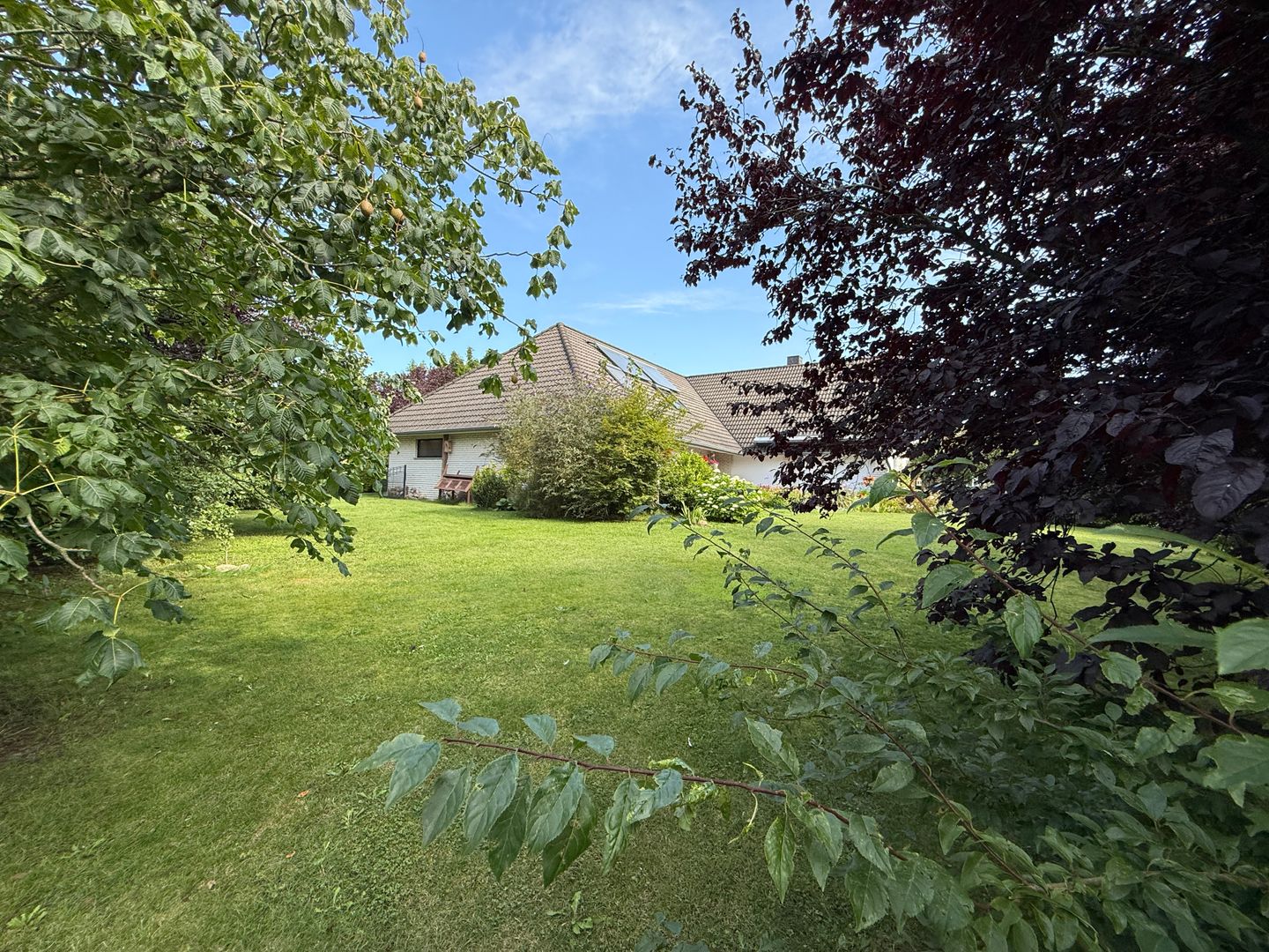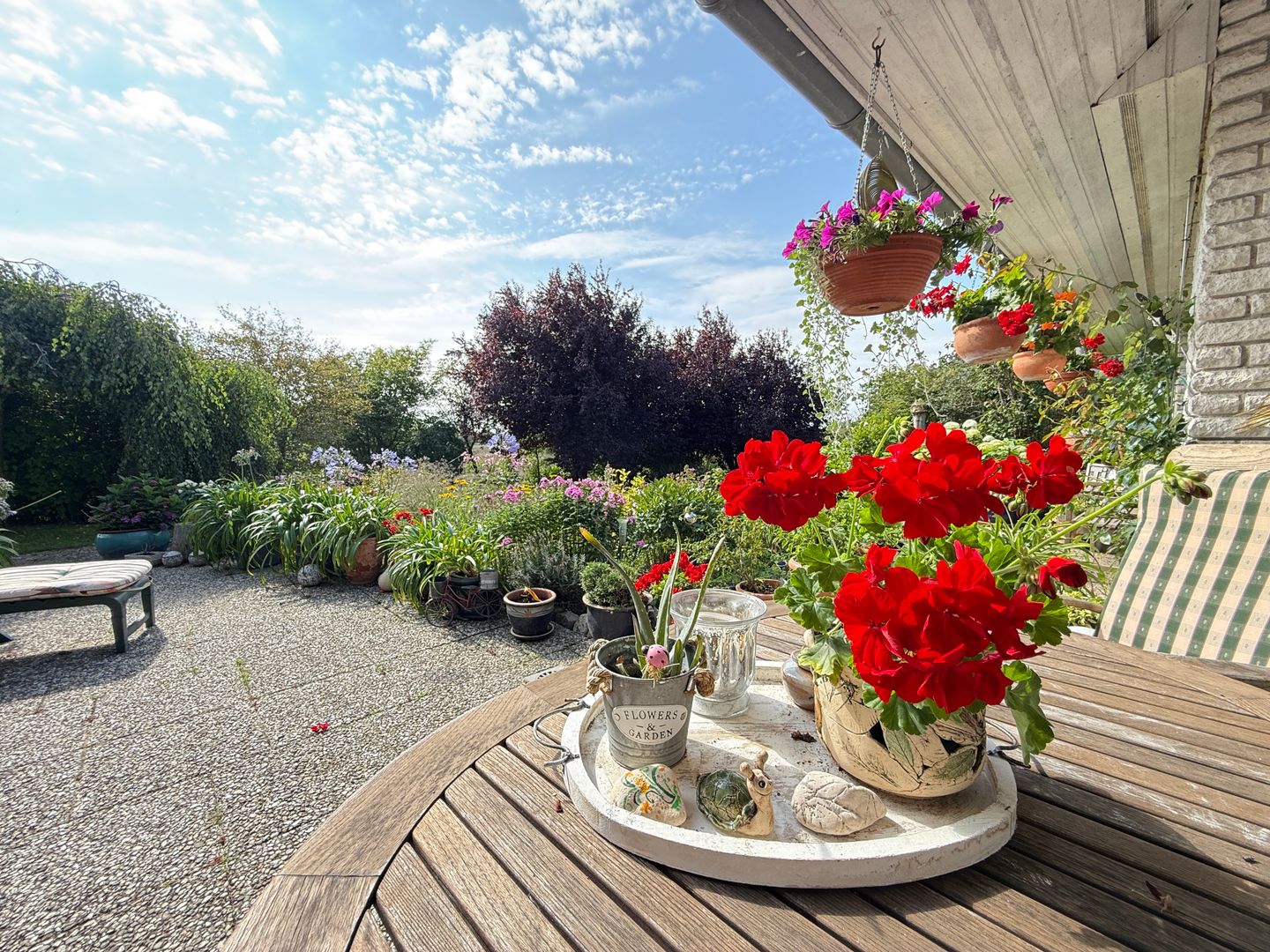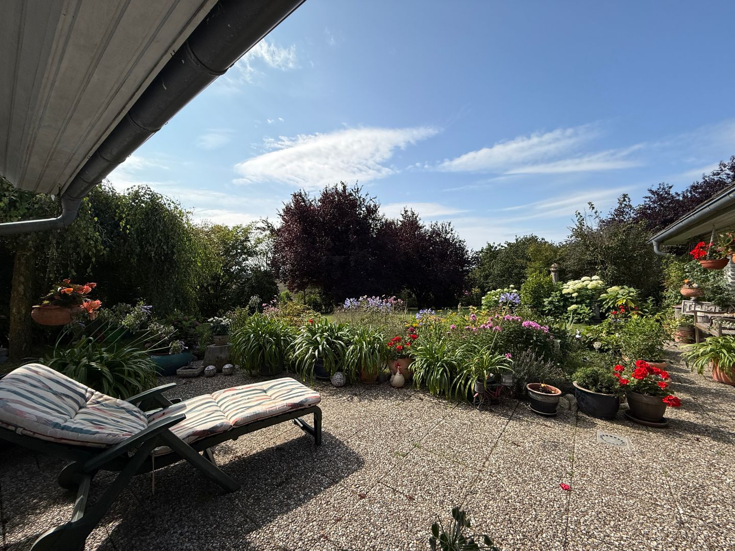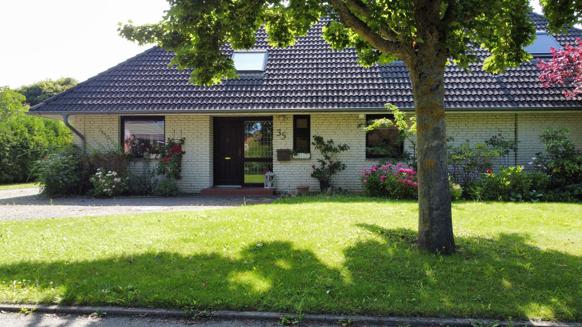 Das 1998 errichtete Haus empfängt Sie mit einem liebevoll angelegten Garten und einem unverbauten Blick über bunte Blumenbeete bis hin zum weiten Feld. Die großzügige Terrasse bietet Sonne von morgens bis abends und wird dank des üppigen Baumbestands zur privaten Ruheoase. Hinter dem Gartenzaun beginnt die Natur – Vogelsang, Felder und Gärten statt Autoverkehr – so dass Kinder gefahrlos spielen können und Ruhesuchende entspannen.