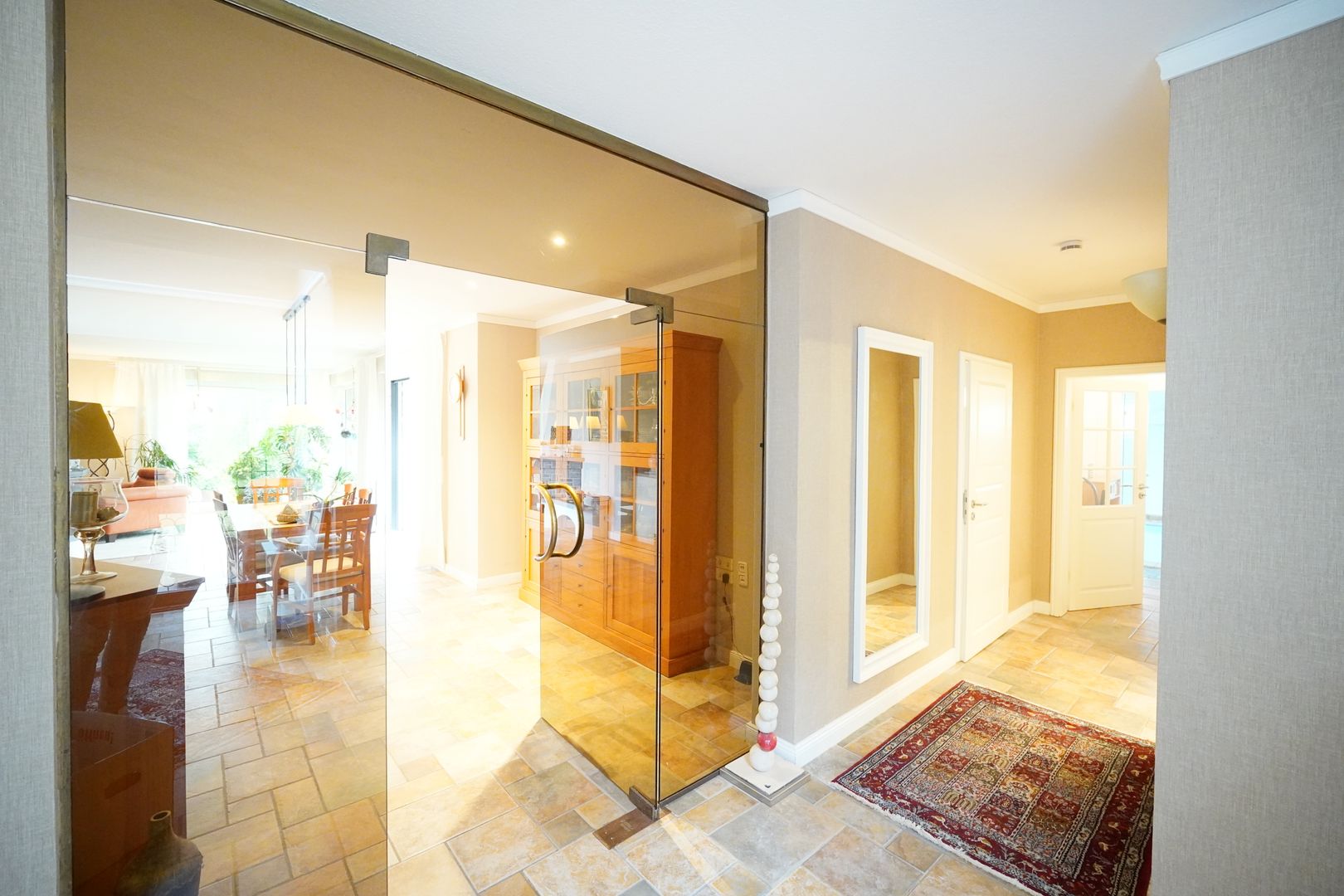 Sie betreten das Haus über den Eingangsbereich. Dieser führt Sie im unteren Bereich gleich zum Gäste-WC und dem jetzigen Büro. Weiter geht es durch eine getönte Glastür in den sehr geräumigen Essbereich mit angrenzender offener Einbauküche. Von der Küche aus haben Sie einen direkten Zugang zum Hauswirtschaftsraum und in die Garage (mit elektrischem Tor) und separaten Ausgang zum Grundstück.