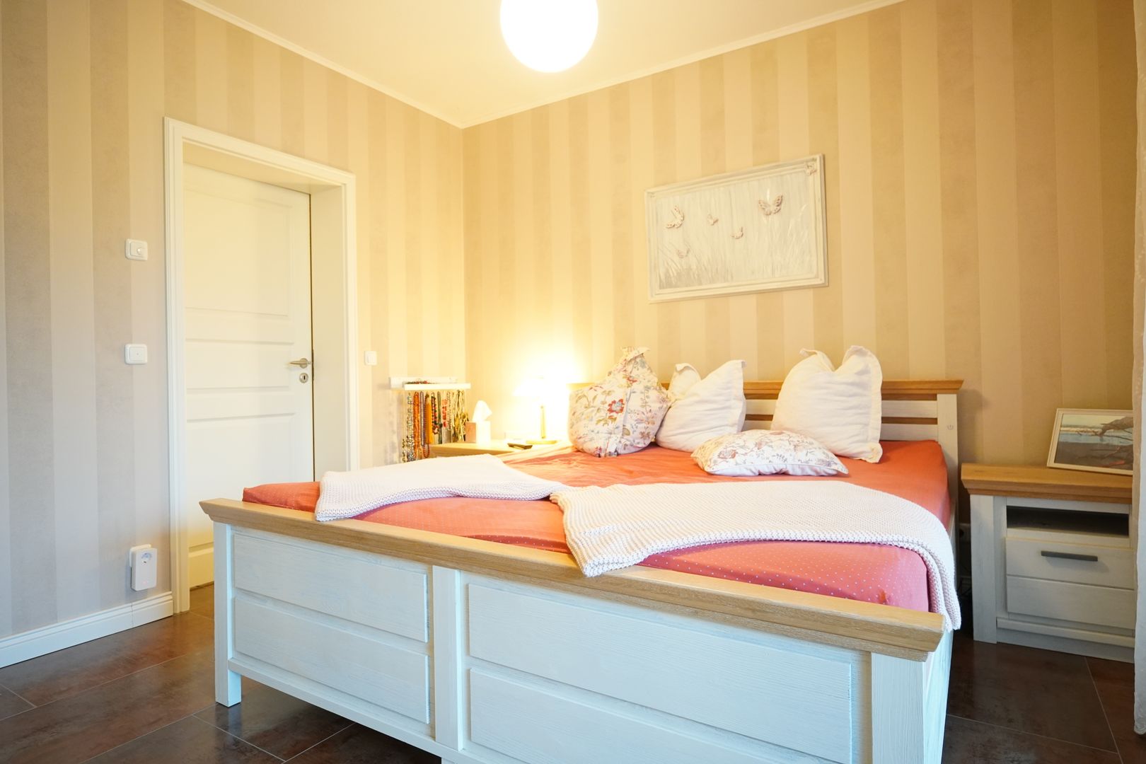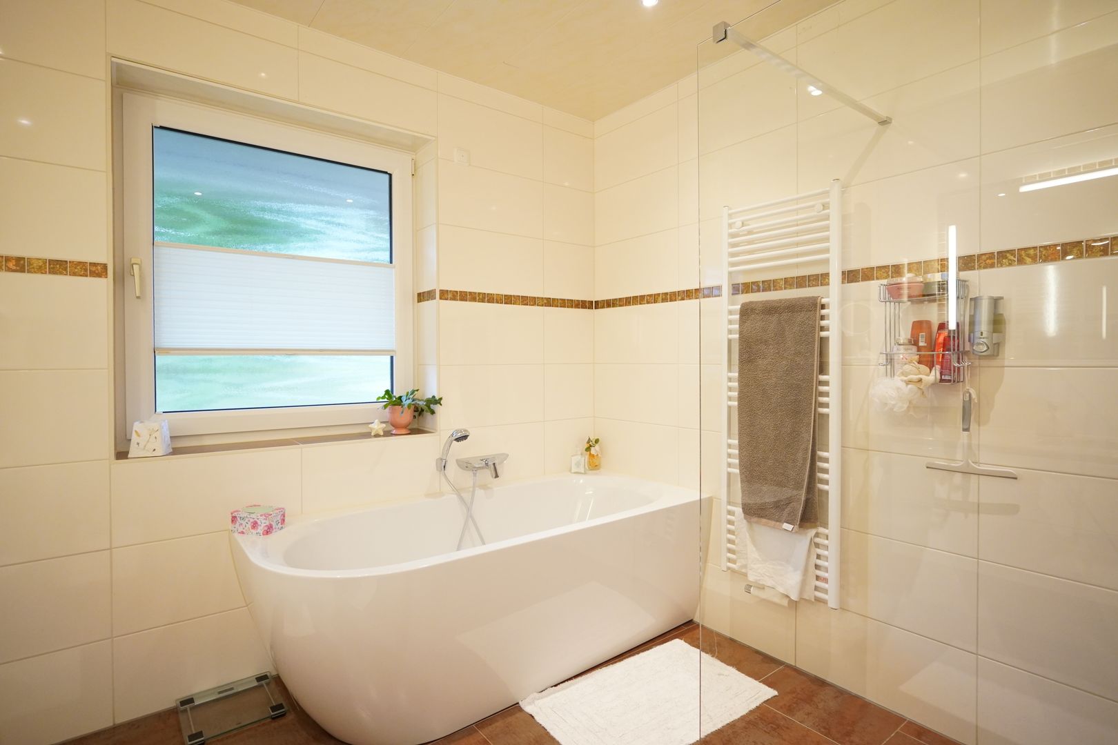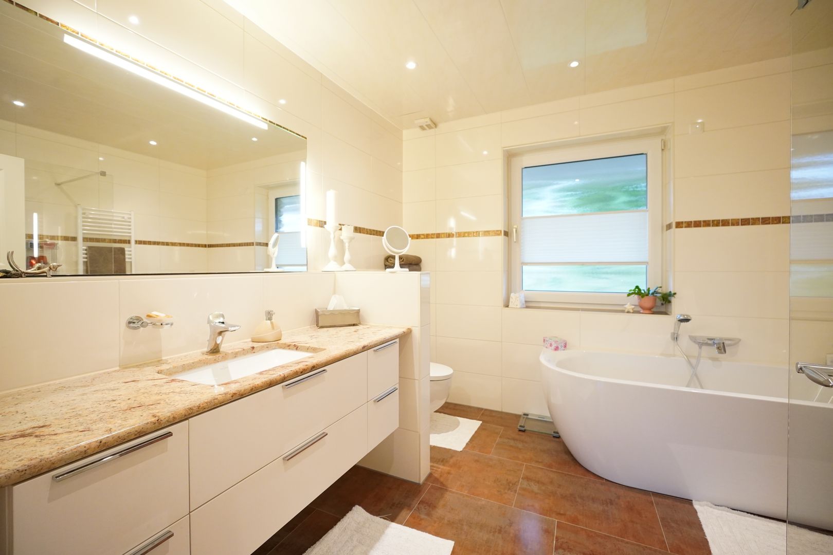 Vom Flur aus erreichen Sie im Erdgeschoss das Hauptschlafzimmer, ebenfalls mit Schiebetür und Blick in den wunderschönen Garten und das Hauptbadezimmer mit ebenerdiger Dusche und Badewanne.