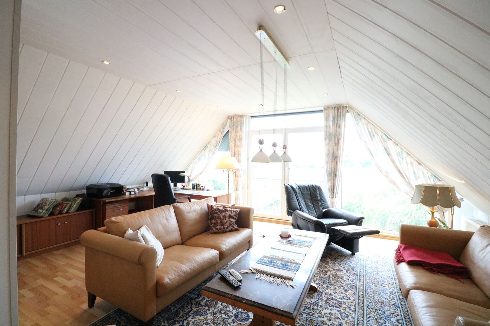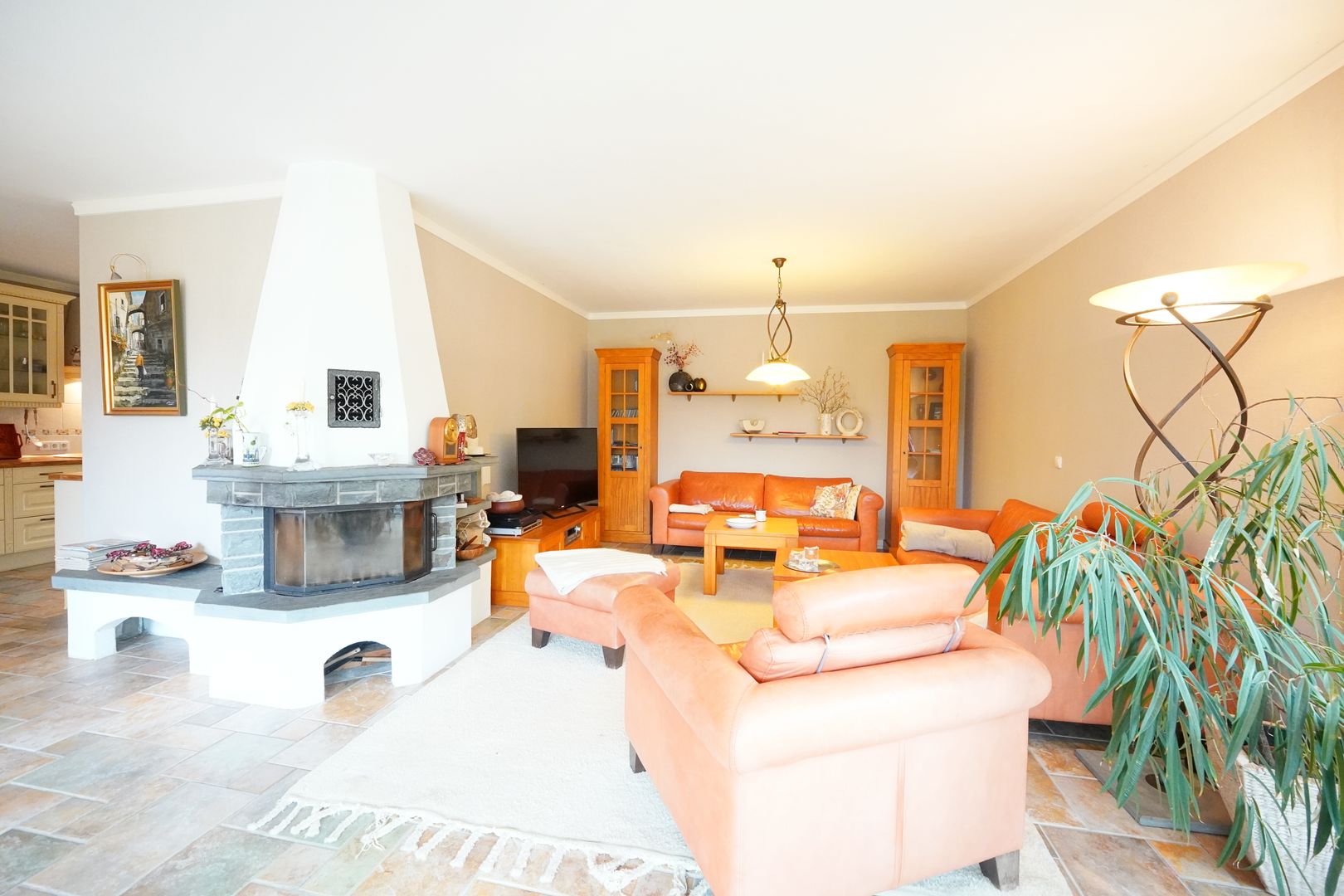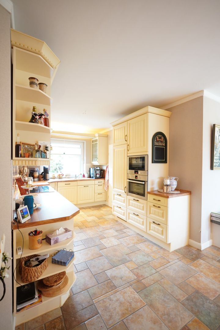 Der Wohnbereich schließt sich so gleich an den Essbereich an und bietet Ihnen mit großen Schiebetüren und einem Panoramafenster einen fantastischen Blick auf das Grundstück. Der vorhandene wassergeführte Kamin gliedert sich perfekt in das Gesamtbild ein und sorgt im Wohnbereich für zusätzliches Wohlfühl-Flair.