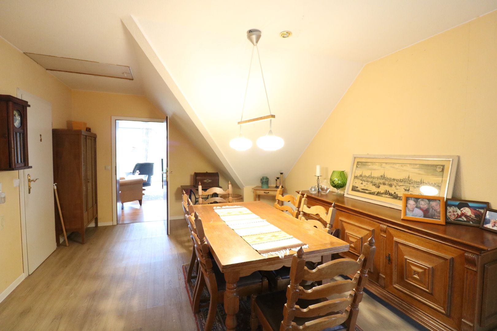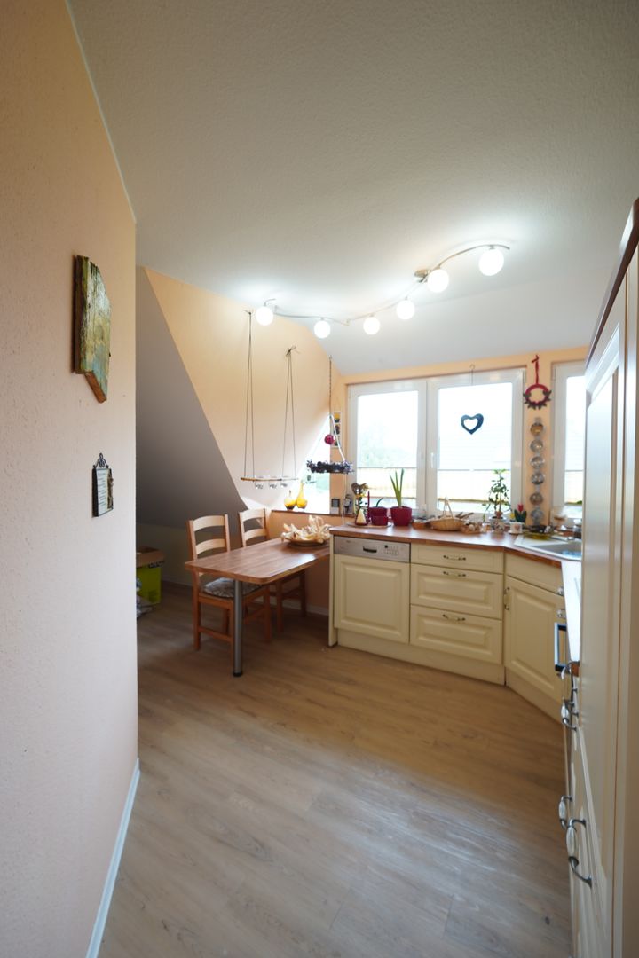 Dieses wurde früher als eigenständige Wohneinheit genutzt. Hier befinden sich 3 Schlafzimmer (eines davon mit Ankleidenische), eine separate Küche mit Einbauküche ausgestattet, sowie ein Badezimmer mit Dusche. Der Eingangsbereich wurde als gemütliches Esszimmer genutzt und bietet Ihnen durch einen eingebauten Lichtkegel mit Fensterglas einen offenen Galerie-Charme, Blick zur unteren Etage und viel Licht. Die Schlafzimmer sind mit Dachfenstern ausgestattet, diese haben alle elektrische Rollläden (außer das Dachfenster in der Galerie und das Dachfenster im Flur vor den Schlafzimmern) die per Fernbedienung gesteuert werden. Im Obergeschoss wurden Heizkörper in jedem Zimmer angebracht.